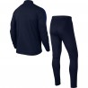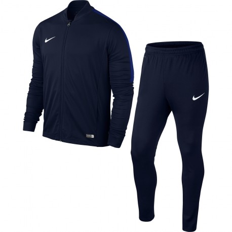 Удобный спортивный костюм, для тренировок или занятий спортом, детская модель NIKE ACADEMY16 KNIT 2 TRACKSUIT артикул номер 808760-451 JR имеет одноцветную темную синюю расцветку и состоит из брюк и куртки. На правом плече куртки расположен стильный белый логотип производителя, компании Nike, а на брюках логотип украшает левую штанину. Куртка имеет удобный классический, проверенный временем покрой, с длинными рукавами с эластичными трикотажными манжетами, что обеспечивает плотное прилегание к телу и исключает потери тепла. Плечи и рукава украшает вставка из яркой синей ткани. На фронтальной стороне расположена полноразмерная молния, которая в верхней части снабжена тканевым защитным элементом, что обеспечивает защиту кожи подбородка и шеи от раздражения при контакте с молнией. На подоле расположен патч с информацией о модели. На боковых поверхностях куртки имеются два симметрично расположенных, вместительных кармана, которые отлично подойдут для транспортировки различных спортивных аксессуаров. Брюки имеют слегка зауженный к низу покрой, что обеспечивает удобную посадку на фигуре. При помощи широкой и эластичной резинки, которая вшита в верхней части, они удерживаются на талии, не сползают во время занятий. Для дополнительной фиксации имеется прочный регулировочный шнурок. На боках брюк расположены два удобных кармана. Костюм изготовлен из качественного трикотажа в состав, которого входят волокна полиэстера, что делает изделие прочным и придает ему эластичные качества, обеспечивая возврат в первоначальное состояние после растяжений и деформаций. Трикотаж обладает прочностью и износостойкостью, что гарантирует длительную эксплуатацию даже при интенсивном использовании. Ткань пропускает воздух, что обеспечивает хорошее вентилирование кожи спортсмена. Для отвода лишней влаги и пота применяется современная технология Dri-FIT, суть которой заключается в применении специальных волокон, которые вплетены в структуру ткани, эти волокна имеют переменную толщину, с одной стороны они впитывают влагу, отводят ее на внешний слой, где осуществляется испарение в окружающее пространство. Костюм отлично подойдет для тренировки футболистов, он может использоваться для других активных видов спорта.